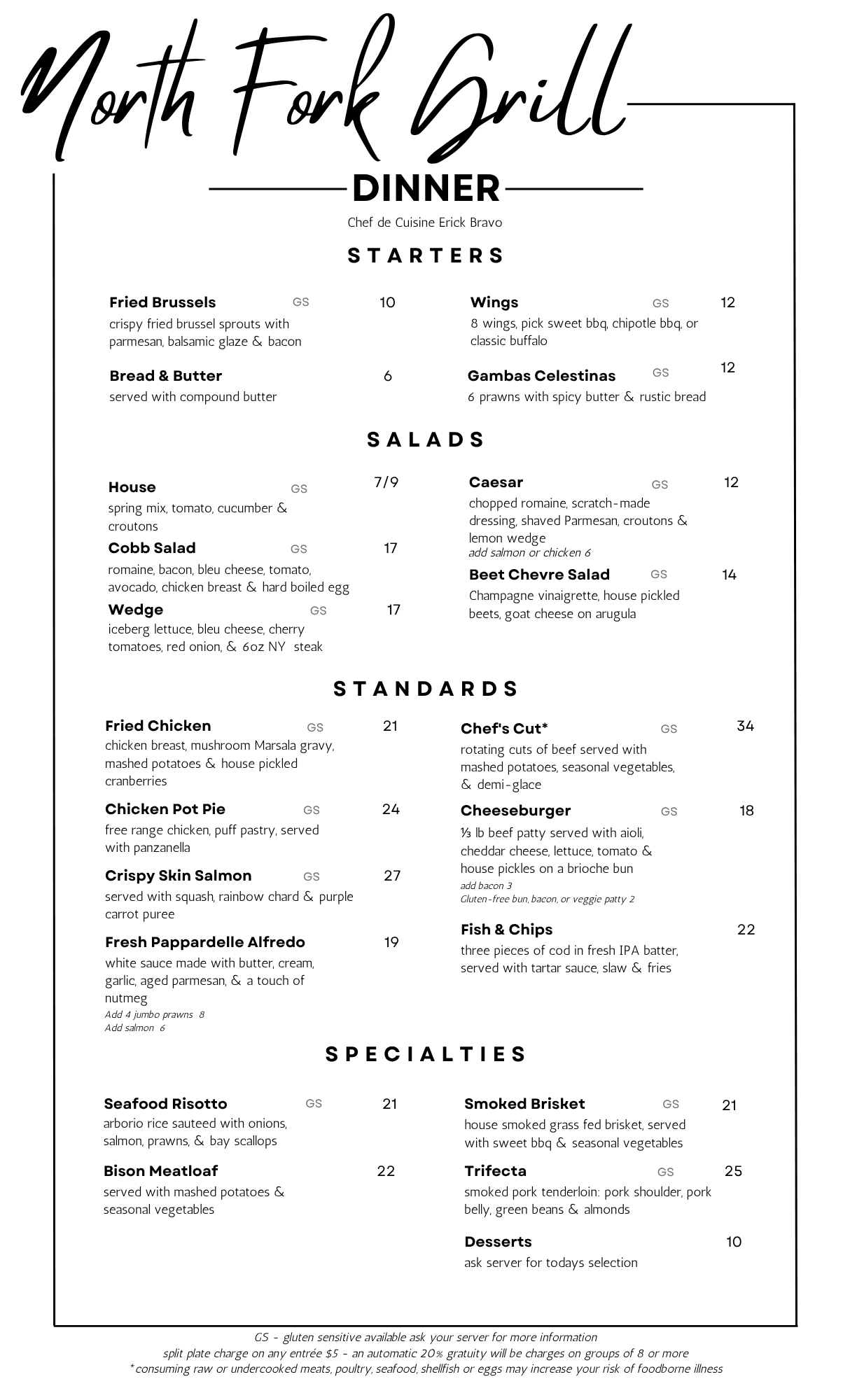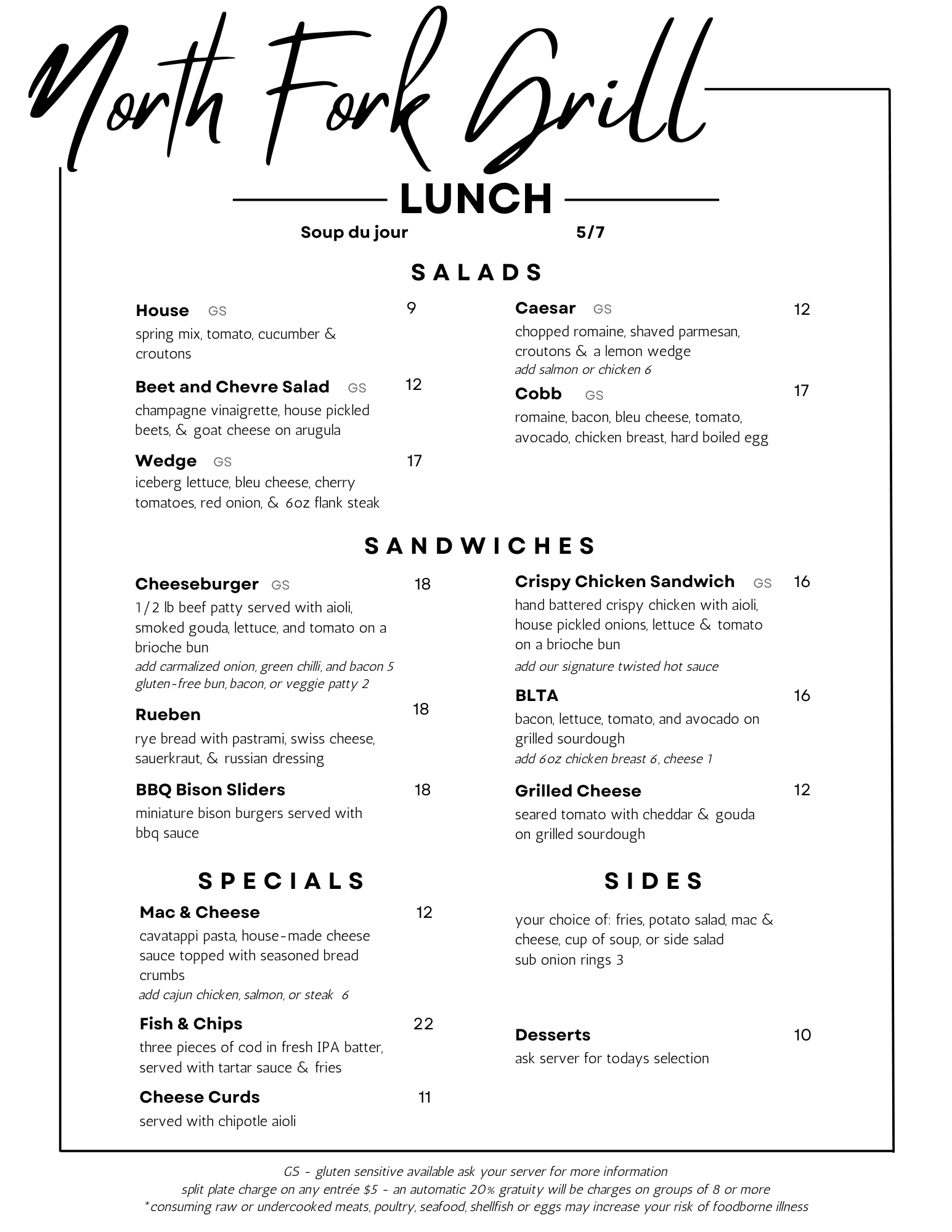 On the main floor of the clubhouse at Lewis River Golf, the North Fork Grill serves up a distinctive Northwest experience. The restaurant features an extensive menu and an adjacent riverside patio. Lunch Menu Dinner Menu Pub Menu Kids Menu